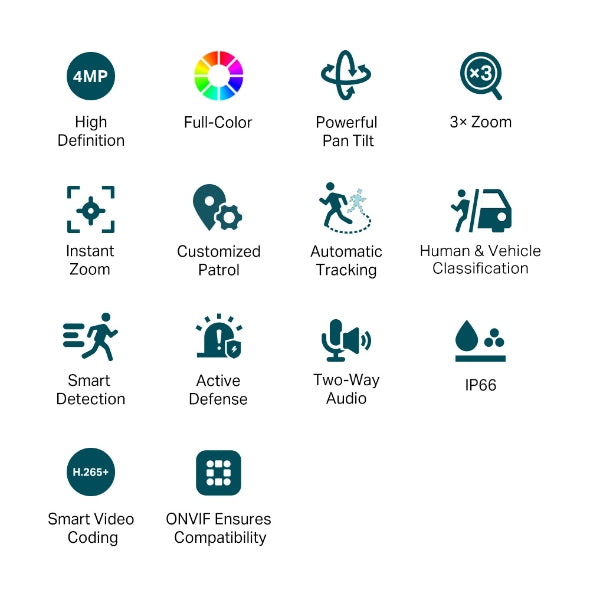 La TP-Link VIGI C540V es una cámara de seguridad IP PTZ para exteriores con resolución de 4 MP (2560×1440). Ofrece imagen a full color 24/7, zoom óptico 3× varifocal (4-12 mm), movimiento horizontal (332°) y vertical (120°), detección inteligente de humanos y vehículos, y alerta activa con luz y sonido. Tiene audio bidireccional, compresión H.265+, almacenamiento vía microSD (hasta 256 GB) y es resistente al agua y al polvo con certificación IP66.